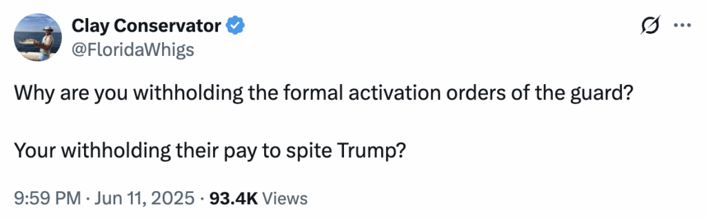 False: Governor Newsom is withholding official activation orders for the National Guard, effectively withholding their paychecks.