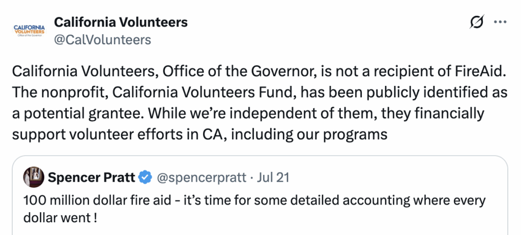 FALSE CLAIM: Gov Newsom & his admin (Cal Volunteers) took money from the FireAid relief fund in Los Angeles – meant for survivors to rebuild their lives.