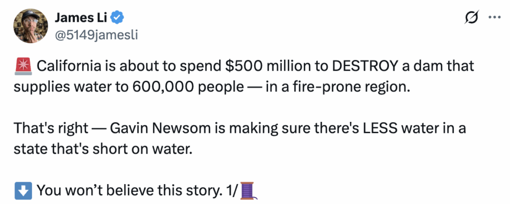 FALSE CLAIM: California is spending $500 million to DESTROY a dam that supplies water to 600,000 people.